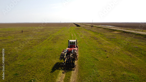 A red tractor is captured from an aerial view, moving through a green and brown field, leaving tire tracks behind it.
