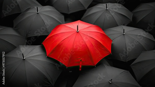A red umbrella standing out in a crowd of black umbrellas on a rainy day, symbolizing uniqueness and individuality.