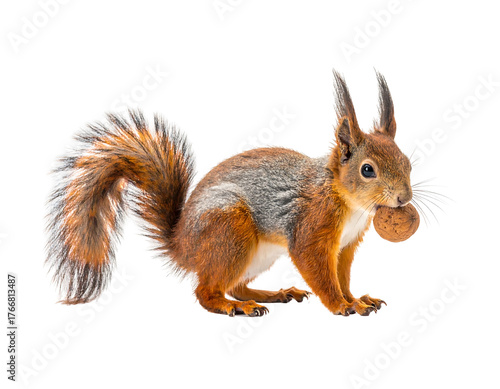 A reddish-brown squirrel holds a nut in its mouth against a black backdrop