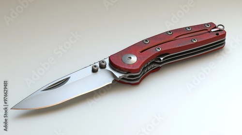 A red-handled folding knife with a sleek stainless steel blade.