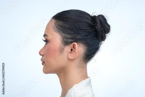 A refined young Asian woman in a close-up side profile, with hair styled in a smooth bun, soft glam makeup, and a minimalist clean look. Isolated on a white background