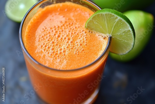 A refreshing cold-pressed carrot juice, with a splash of ginger and fresh lime