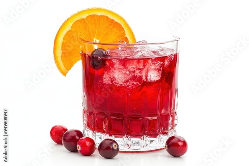A refreshing drink with ice, garnished with orange and cranberries.