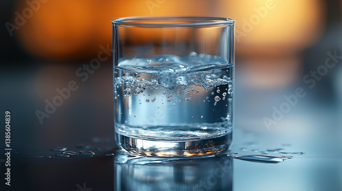 A refreshing glass of sparkling water with bubbles, set on a reflective surface with warm, blurred background lights.