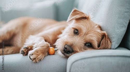 A relaxed dog resting on a couch, looking content with a small toy nearby.