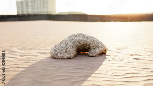 A remarkable and unusual natural formation rests on the smooth sands, casting a long shadow during a tranquil sunset. The warm hues of the sky enhance the serene atmosphere.