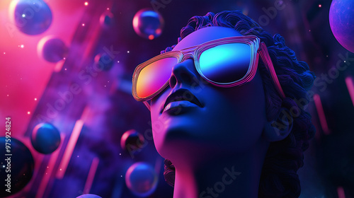 A Renaissance-style female statue wearing colorful sunglasses with neon lenses, floating in a space filled with abstract bubbles and futuristic architecture.