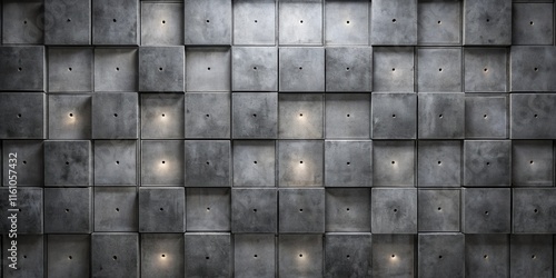 A repeating pattern of square concrete tiles with small holes, some illuminated with soft light.