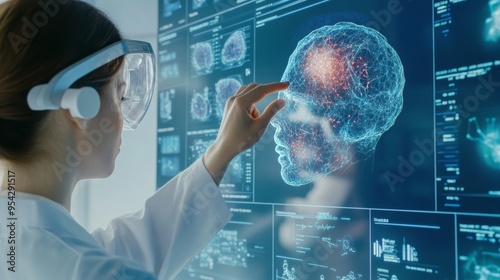 A researcher interacts with digital brain interface, showcasing advancements in human machine interfaces. scene highlights innovation and technology in neuroscience.