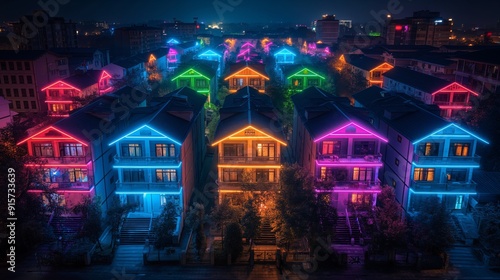 A residential neighborhood of suburban houses illuminated with colorful neon lights showing diversity in housing in an innovative and futuristic community of homes using future smart technology