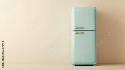 A retro-style refrigerator with a pastel blue finish, highlighted against a soft beige backdrop.
