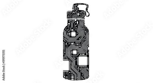 A reusable water bottle is designed with a complex circuit board pattern.