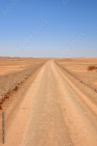 A road in the desert with a blue sky in the background. The road is empty and the sky is clear