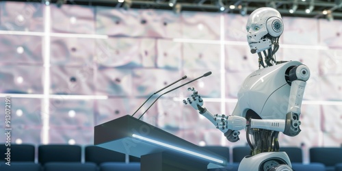 A robot is standing in front of a podium and holding a microphone. The robot is wearing a white suit and he is giving a speech. Concept of technology and innovation