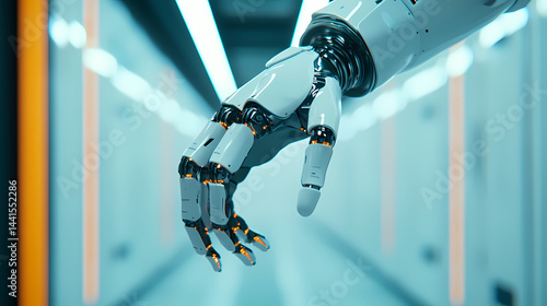 A robotic hand extends in a futuristic, brightly lit corridor, showcasing advanced technology and artificial intelligence.