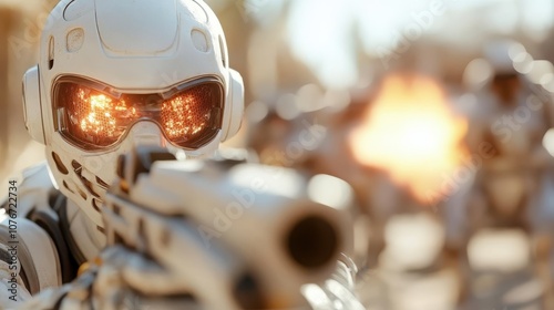 A robotic unit is depicted in combat, showcasing its focus on advanced warfare techniques amid a flaming background, illustrating power and futuristic military strategies.