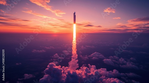 A rocket ascends into a colorful sky, symbolizing space exploration and technological advancement.