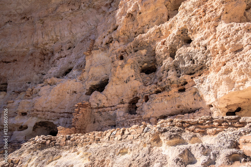 A rocky cliff with a few small holes in it