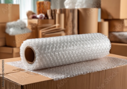 A roll of bubble wrap resting on a cardboard box, surrounded by other packing materials