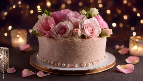 A romantic closeup of a birthday cake on a dark background.