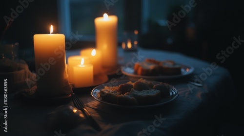 A romantic dinner for two, with candles illuminating the table, a dessert of cake on a plate, and a warm, inviting ambiance.