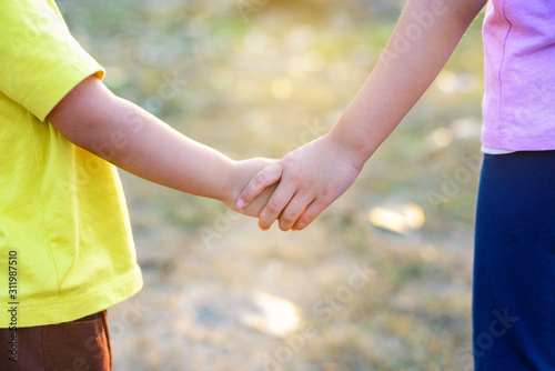 A romantic image of an older sister's hand holding her brother's hand together.