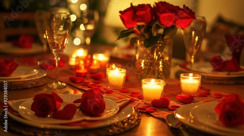 A romantic Valentine's Day table decoration setup with red roses, heart-shaped plates, and glowing candles.