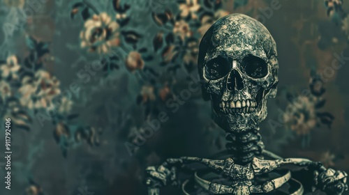 A romanticized skeleton wallpaper with elegant bone illustrations set against a richly textured