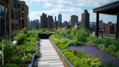 A rooftop garden offers a peaceful retreat amidst the bustling city skyline.