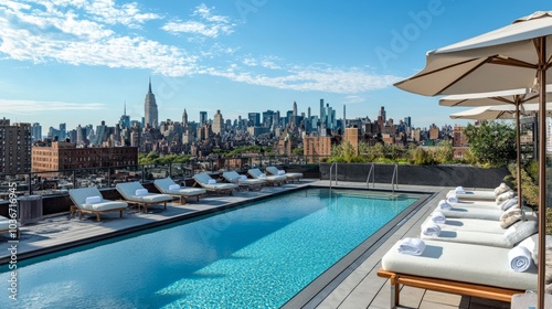 A rooftop pool deck with umbrellas and loungers, enjoying the sunshine with sweeping city views