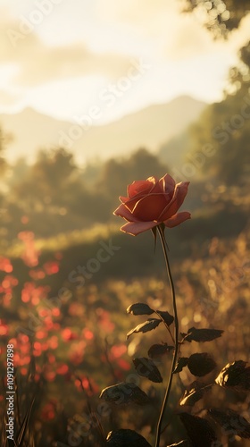 A rose in the foreground, with a blurred background of an old farm featuring silhouettes of trees and mountains