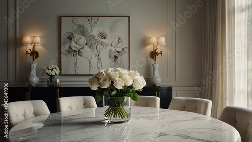 A round marble dining table with white chairs and a vase of white roses on top. The table is set in a modern dining room with a large painting of roses on the wall and two sconces.