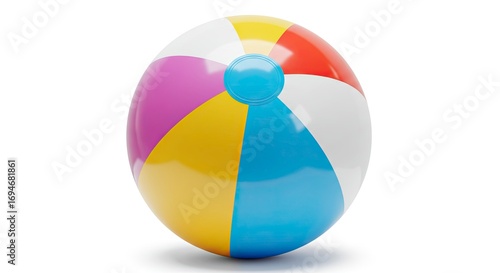 A round multicolored beach ball rests on a white surface casting a shadow