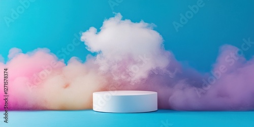 A round podium sits centered against a vivid blue background enveloped in swirling rainbow-colored steam