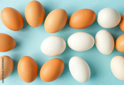 A row of assorted brown and white chicken eggs on a pastel blue background , wholesome, Easter