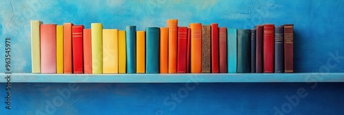 A Row of Colorful Books on a Blue Shelf