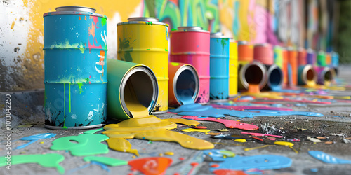 A row of colorful paint cans, labeled with different denominations, spilling their contents onto a dirty sidewalk.