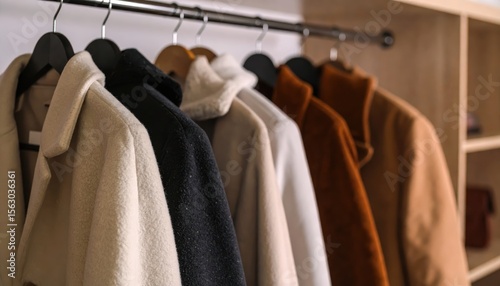 A row of fashionable coats in diverse colors hanging neatly in a closet, showcasing modern style and texture variety.