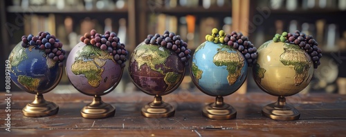 A row of five antique globes with different colored grapes growing on them. The globes are sitting on a wooden table in front of a blurred background of bookshelves.