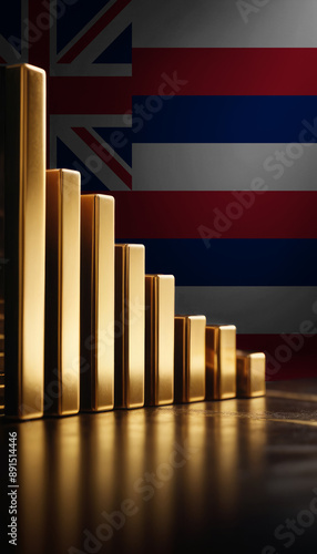 A row of gold bars of varying sizes is arranged in front of an Hawaii flag, symbolizing wealth and economic strength