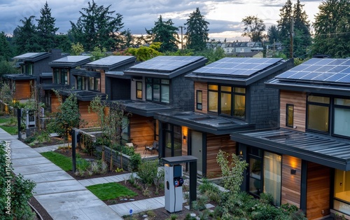 A row of modern, eco-conscious homes with rooftop solar panels and electric vehicle charging stations