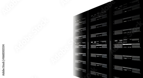 A row of network server racks for data storage in a modern technology center