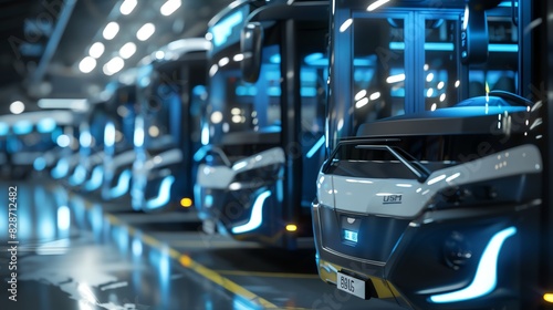 A row of sleek, modern buses in a factory setting, illuminated by bright lights.