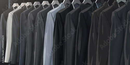 A row of sleek, shiny suits hanging in an executive's closet, each garment symbolizing the importance of appearance and professionalism in the workplace.