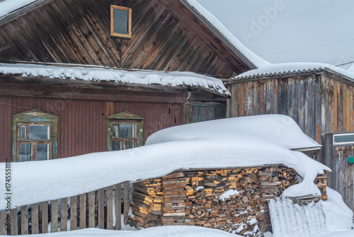 A rural old country house in the winter cold. Wooden house in the village. In front of the log cabin, the firewood is covered with snow.