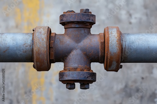 A rusted steel pipe intersection showing the cross and pipe connections
