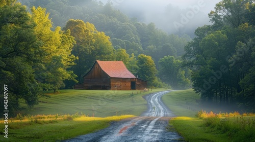 A rustic barn on a rainbow road, lush nature surrounding, vibrant colors after rain, mist rising from wet ground, serene atmosphere