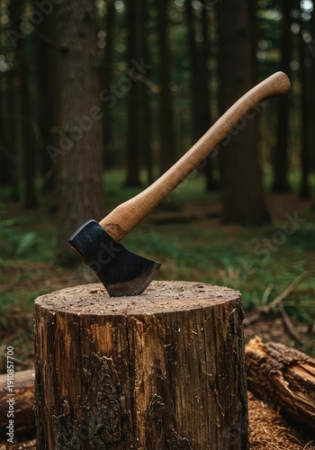 A rustic chopping axe blade is embedded firmly in a weathered wooden tree stump in a dense, quiet wilderness forest environment ,logging ,blade ,foliage