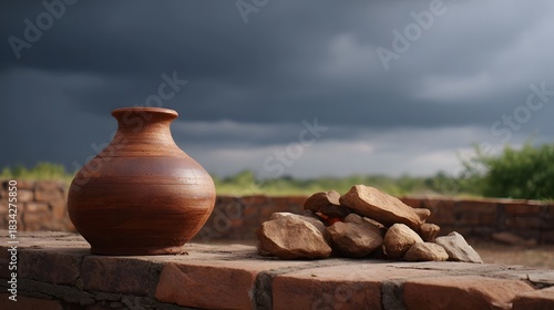 A rustic clay pot and a pile of stones rest on a brick wall under a dramatic stormy sky