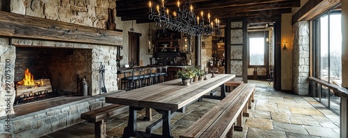 A rustic dining room in a farmhouse with a stone fireplace, a long wooden table with bench seating, and an iron chandelier overhead